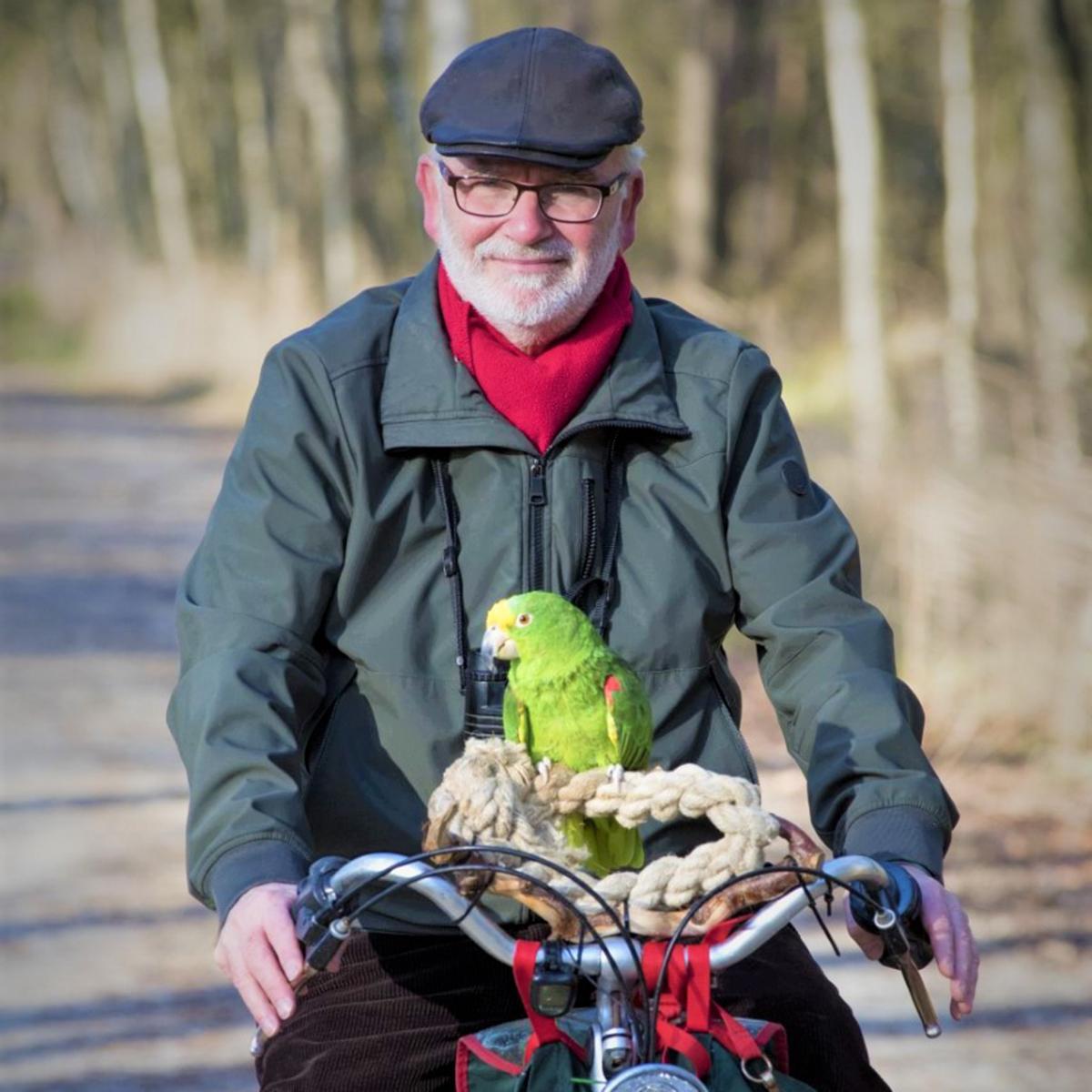Op de foto, gemaakt door fotograaf Dimitri Steinmeijer, fietst Jan Hooimeier als vogeldierenarts met de 70-jarige Geelvoorhoofd amazone Dorus. Dorus zit daarbij te fluiten en te zingen.