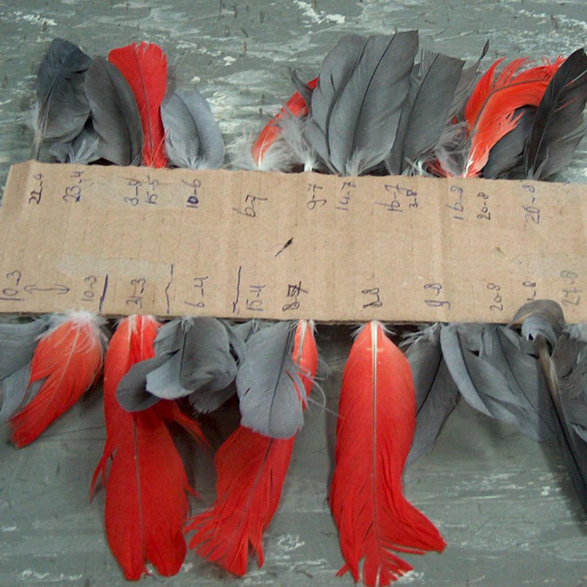 Verzamel vleugel- en staartpennen, die vallen tijdens het ruien. Steek deze in een stuk karton en noteer de datums erbij. Linker pennen links en rechter pennen rechts. Je kan ze ook in een schriftje plakken. Op deze manier kan worden gecontroleerd of de vogel symmetrisch ruit. Bovendien kunnen de nieuwe veren worden vergeleken met de oude veren. De nieuwe veren zijn normaal mooier dan de oude veren. Asymmetrische rui en minder mooie nieuwe veren zijn een signaal dat er “iets” aan de hand is. Dat hoeft niet te wijzen op een ziekte maar wel op voedingsfouten, ongunstige klimaatomstandigheden, stress/welzijnsproblemen.