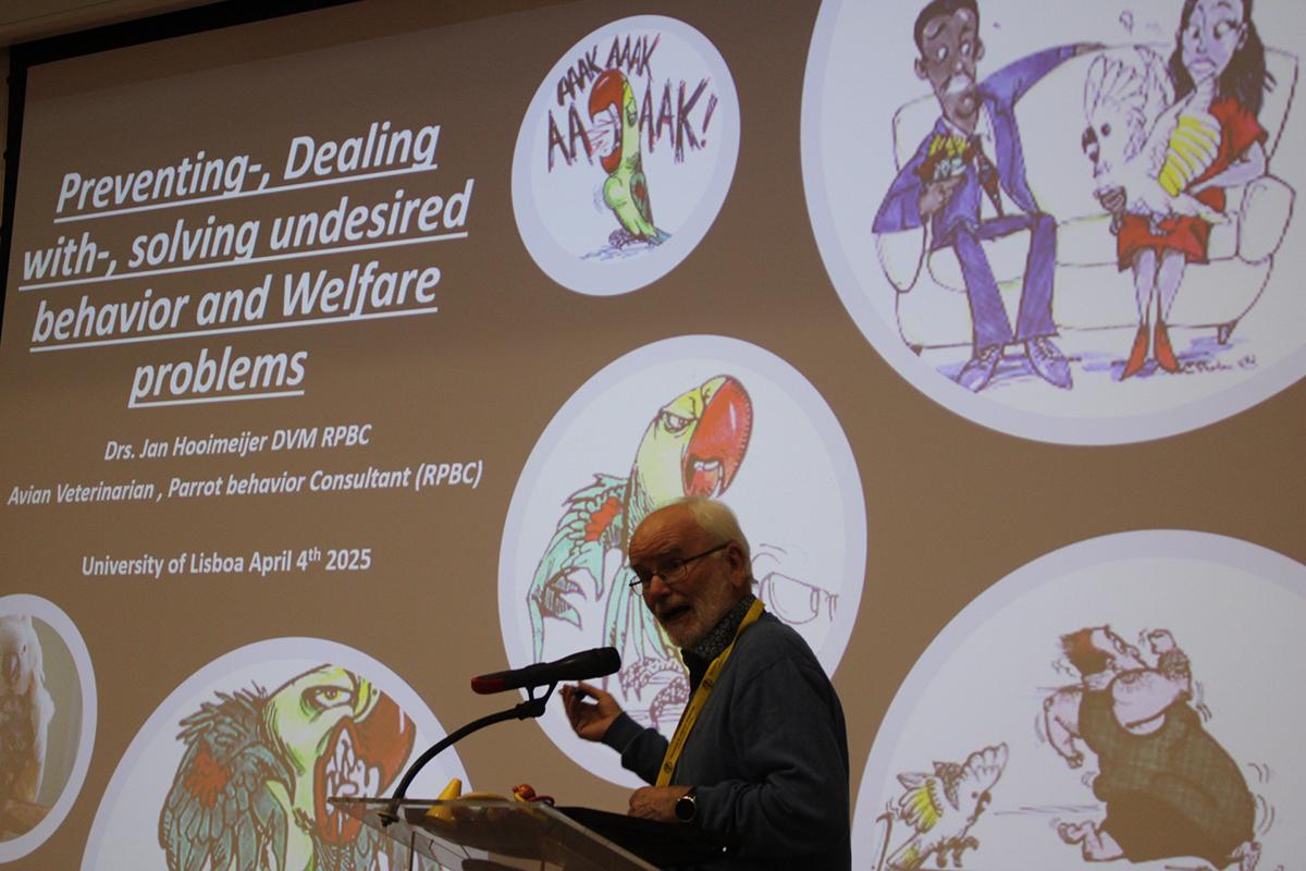 In het weekend van 4-5 april was Jan Hooimeijer uitgenodigd door de studiegroep “FAUNA” van studenten diergeneeskunde van de universiteit van Lissabon. Elke keer blijft het geweldig om te zien dat er een toenemende belangstelling is voor de thematiek van gedrag en welzijn. Het besef dat ons eigen gedrag bepalend is voor het gedrag van dieren/papegaaien is voortdurend een vernieuwende boodschap. Ook dat gezondheidsproblemen gepaard gaan met gedragsproblemen en dus ook welzijnsproblemen blijft telkens een nieuw inzicht.