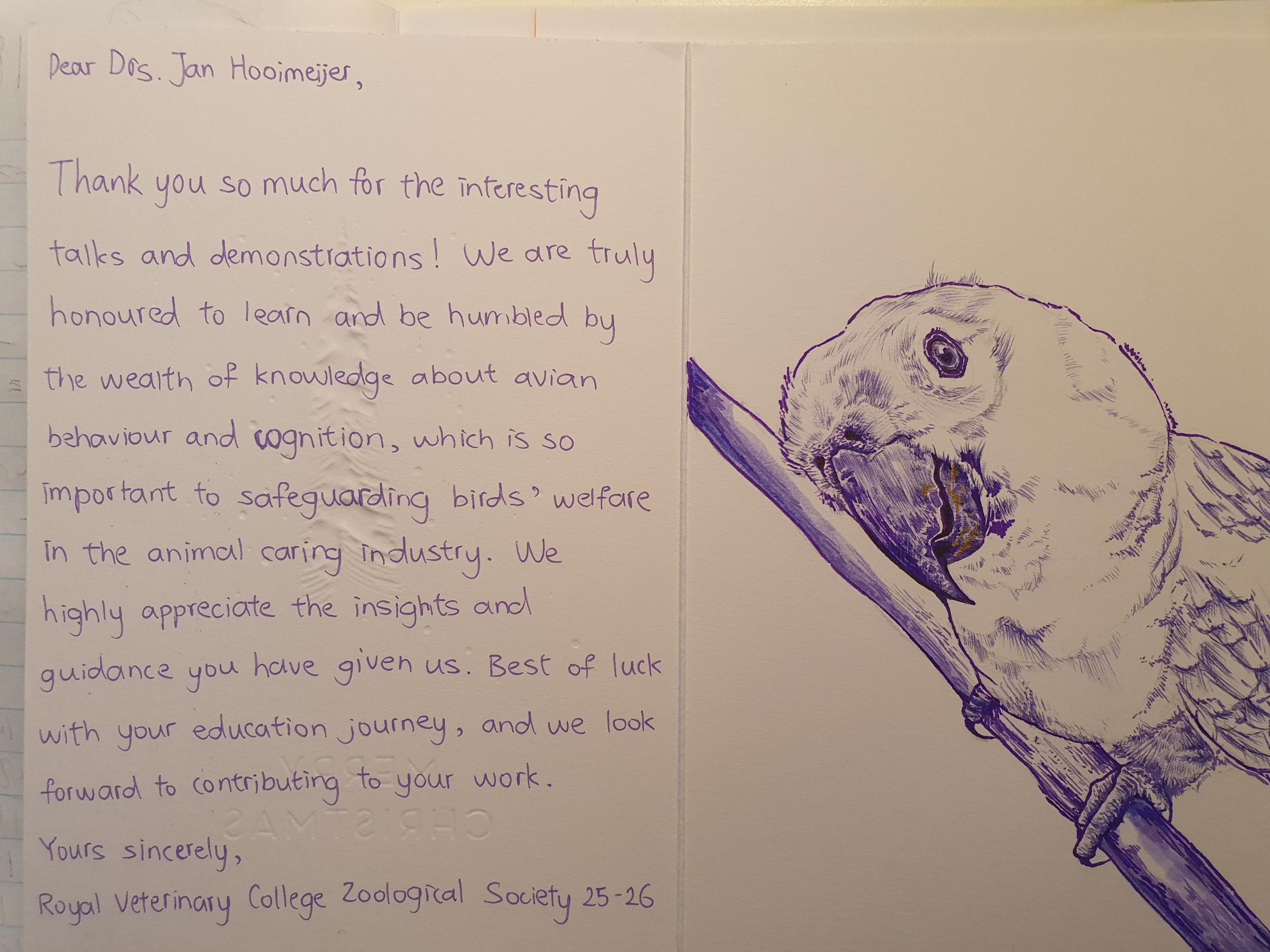 Afgelopen weekend was drs. Jan Hooimeijer te gast bij Royal Veterinary College, University of London om daar een seminar te verzorgen voor de studenten dierengeneeskunde. Het was weer een geweldige ervaring voor Jan en de studenten. Het is iedere keer weer echt speciaal om te ervaren hoe de studenten “het verhaal” ervaren/beleven en hoe blij en dankbaar ze zijn met de inhoud. Voor een aantal studenten was het meer dan geweldig en na afloop ontving Jan nog een ontzettend leuk bedankt kaartje.